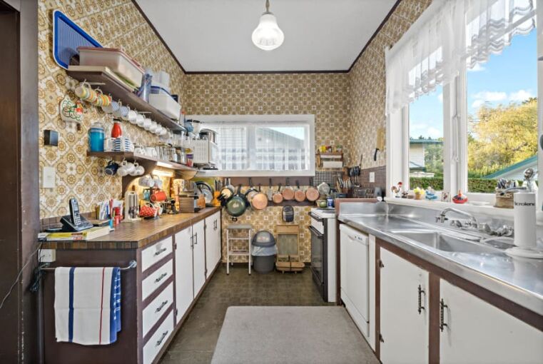 This kitchen was once the heart of the home — filled with character and nostalgia — but time had caught up with it. The patterned wallpaper, dark tones, and closed-in layout spoke of another era, creating a space that felt more cluttered than cosy.